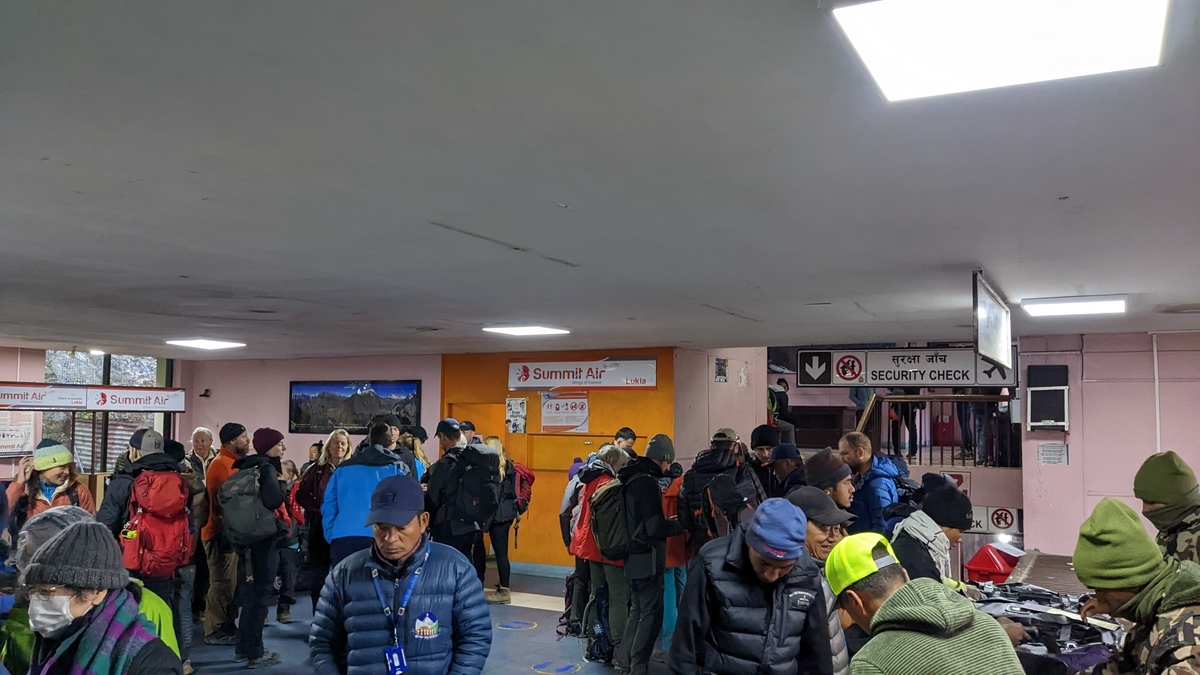 ルクラの空港・・めっちゃ小さいです(あたりまえ)けど帰りたいトレッカーがたくさんおしよせてカオス状態。しかも、ここって他のルートから来てる人たぶんいないと思うんですよ、数日前に下から飛行機もしくは徒歩で上がってきている人だけ・・なのに手荷物検査えらい真剣・・っていうかしつこい
