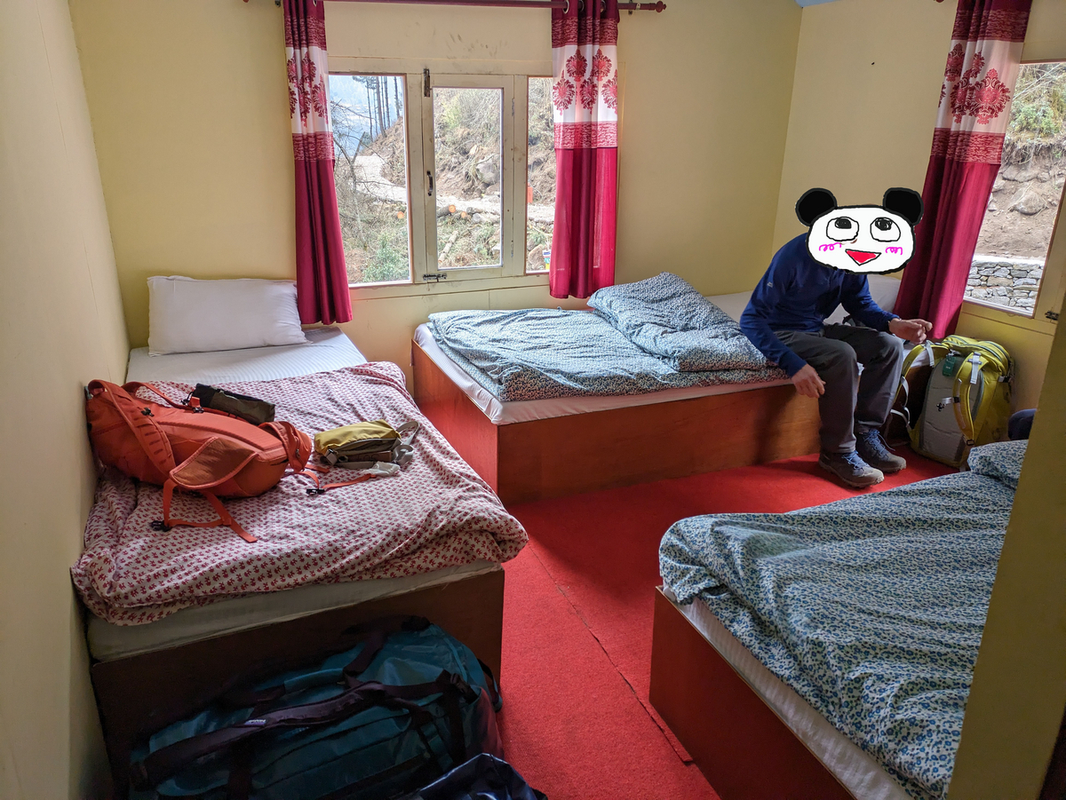 お部屋は角部屋で日当たりが大変よく暖かかったです。しかし、ネパールロッジあるある・・なぜ部屋にフックや棚がないのか??ちょっとでいい、荷物置き場作ってください(;´∀`)。