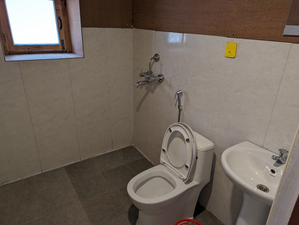 なんとシャワー&トイレつき!!ストレス緩和!!お湯はぬる~~いのが出るだけですが、足が洗えるのはうれしい。そしてここでもネパールロッジあるある・・便器のすぐ隣にシャワー・・固定のシャワー・・・これシャワーしたら絶対にトイレがずぶぬれになるよね・・・気にしないのか?使うことを想定していないのか??なぞ設計。日本のインテリアコーディネーターを派遣してほしい・・(;´∀`)。