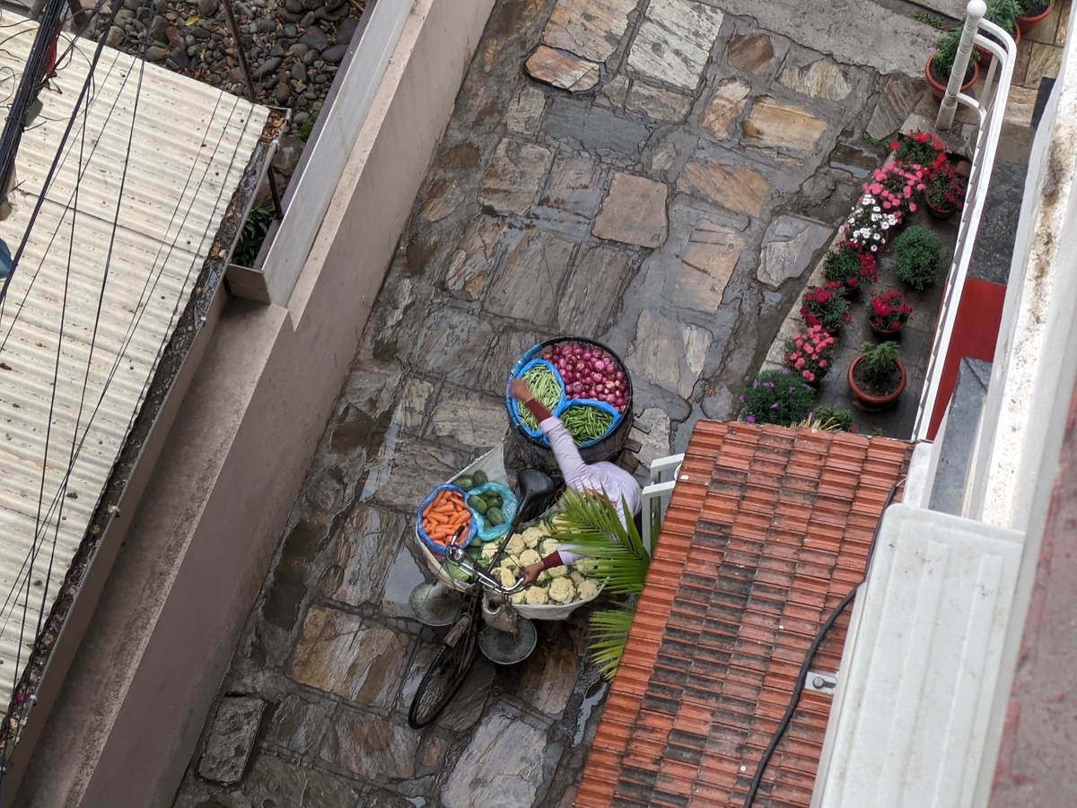 野菜を自転車に大量に乗せて行商している人を上から見ているわたし・・