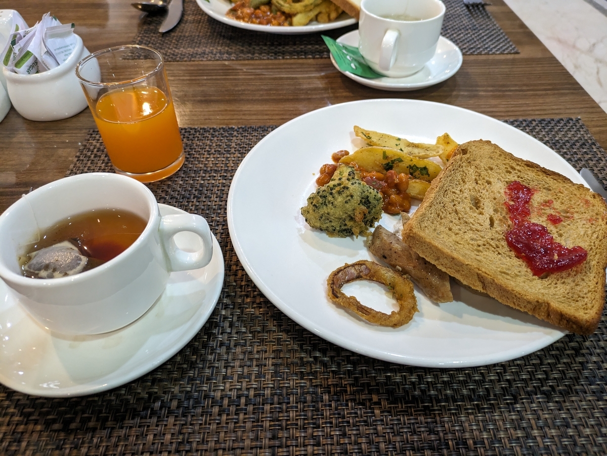 朝ごはんを食べる・・・朝から謎のメニュー「YASAI TENPURA」なるものがあって、ちょっとだけ食べてみたけど、ぶにぶにしていて脂っぽい(笑)。それにパンと合わない気がするのは私だけか???