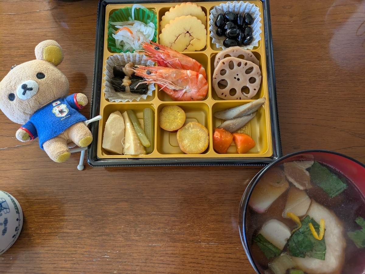 朝ごはんに、パン焼き機で作ったお餅入りお雑煮と、OKストアで昨日買ったフジッコのミニおせちセットをいただきました。